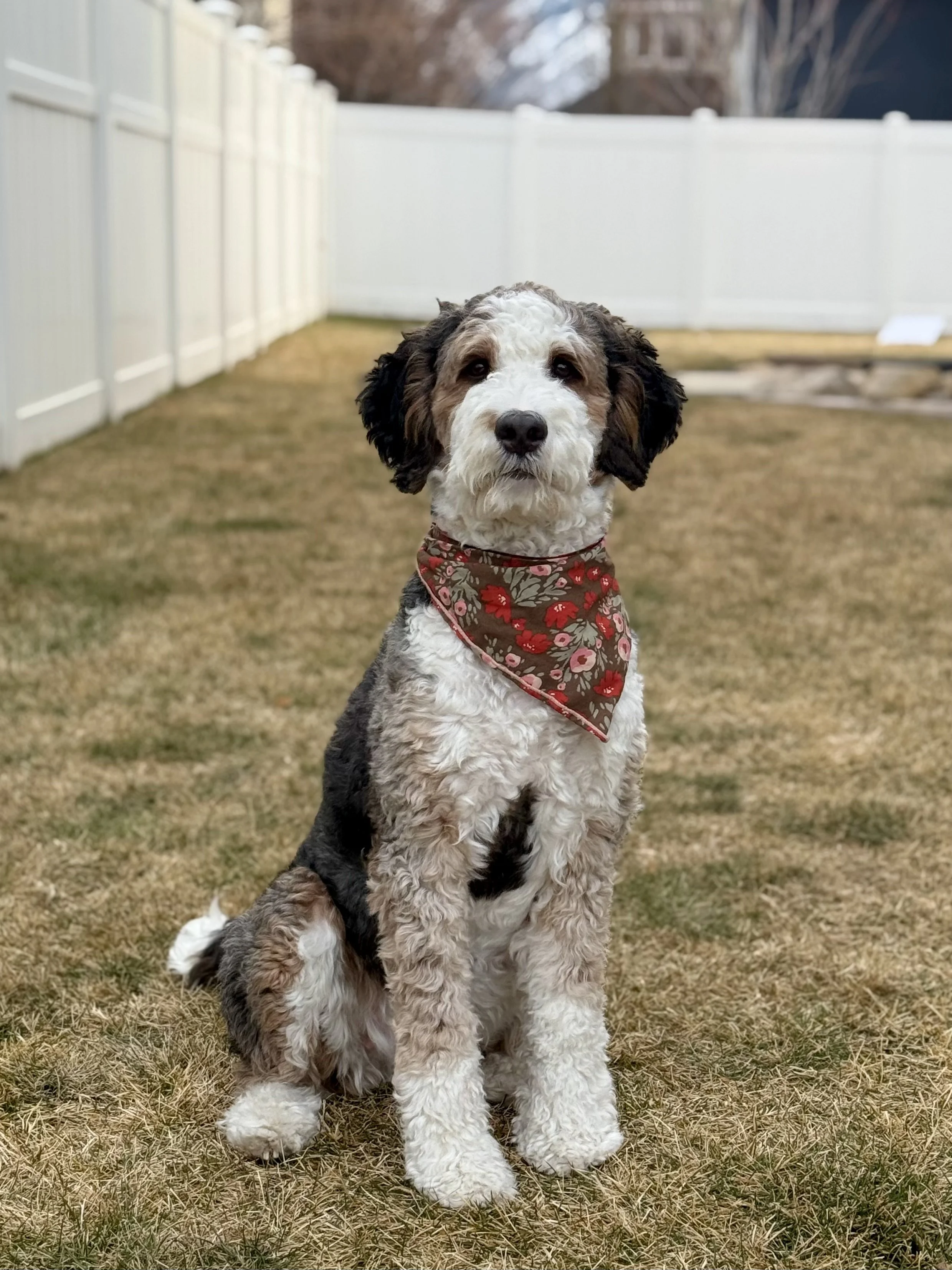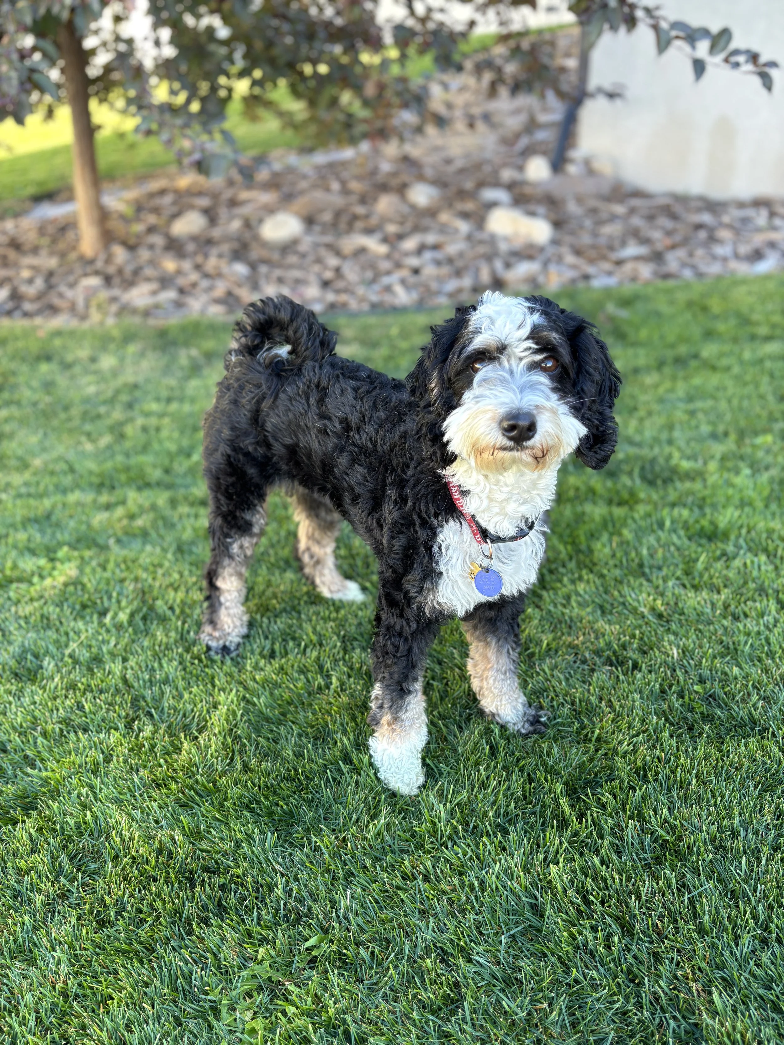 Tala is a 19 pound mini bernedoodle with the best temperament. She loves to play; her ball is her favorite thing and fetch is her favorite game. She is smart and eager to please. She has a long list of fun tricks and commands she knows. We adore Tala and her sweet loving temperament. She is cleared for all tested genetic disorders.