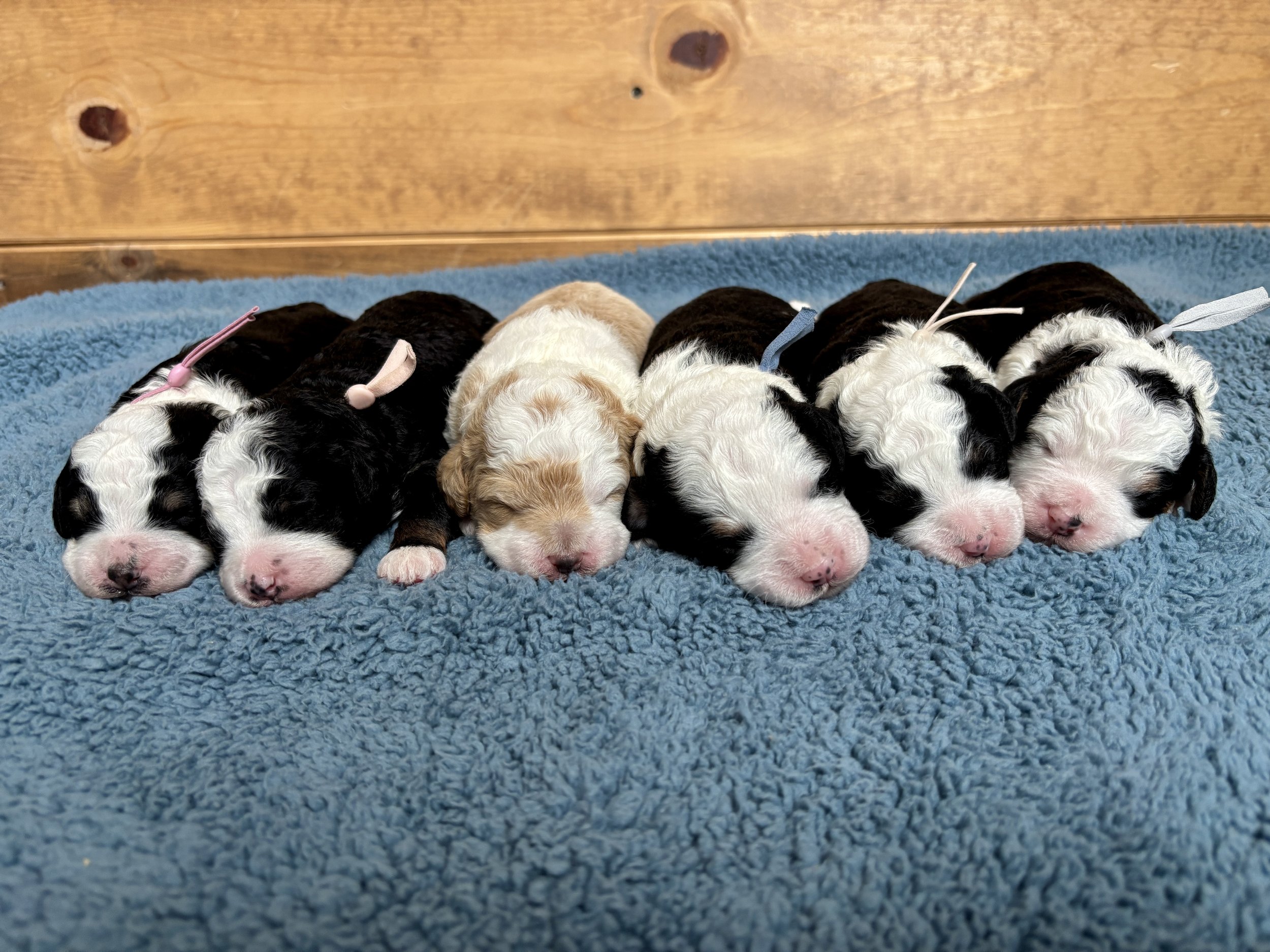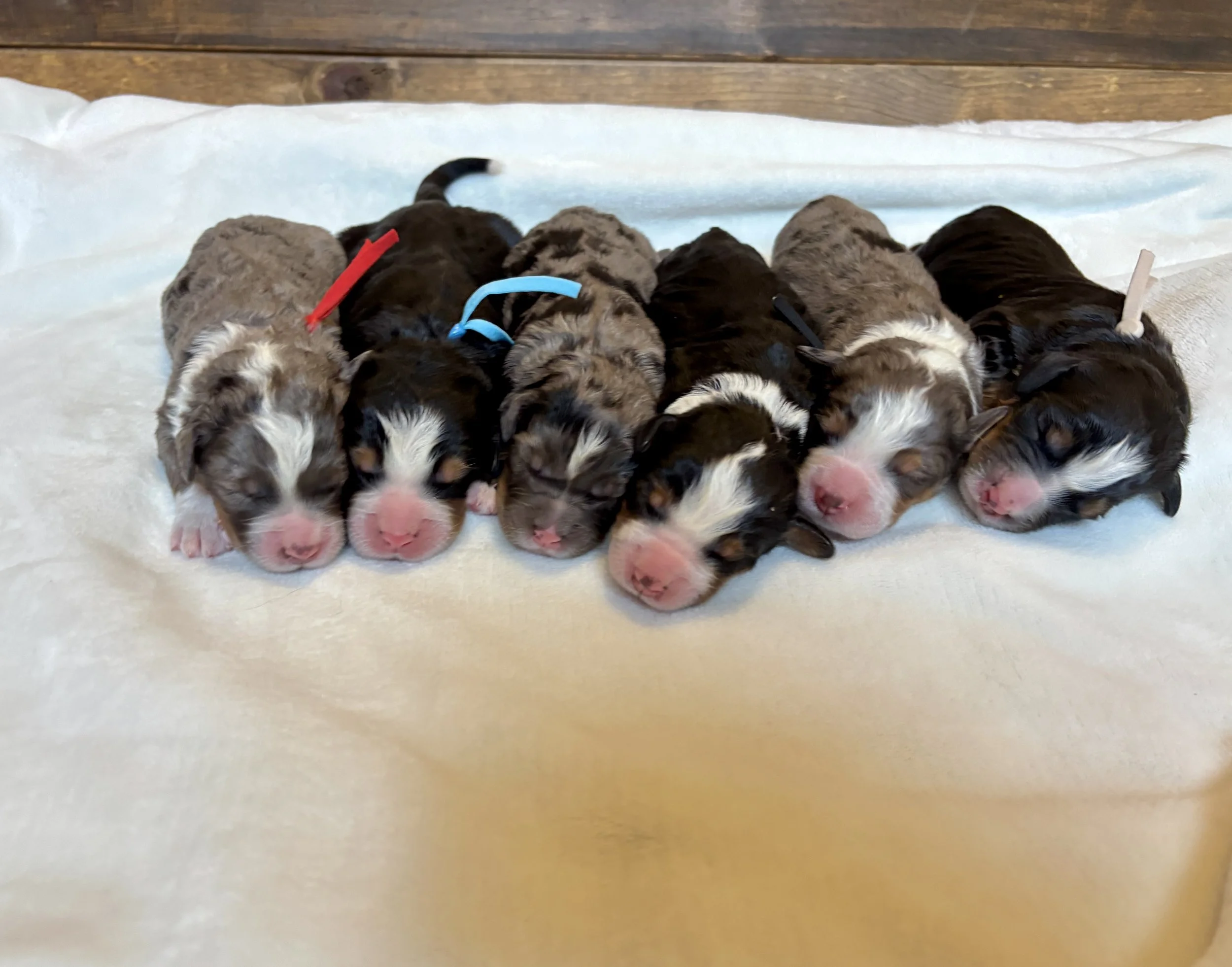 We are so excited for this litter of mini bernedoodles from Tala and Vegas. Tala delivered 6 sweet babes (3-female and 3-male) on November 7, 2025. These puppies are expected to weigh between 15-25 pounds. They’ll have wavy / curly, non shedding coats. We are confident that these puppies will have the best qualities of each parent.
