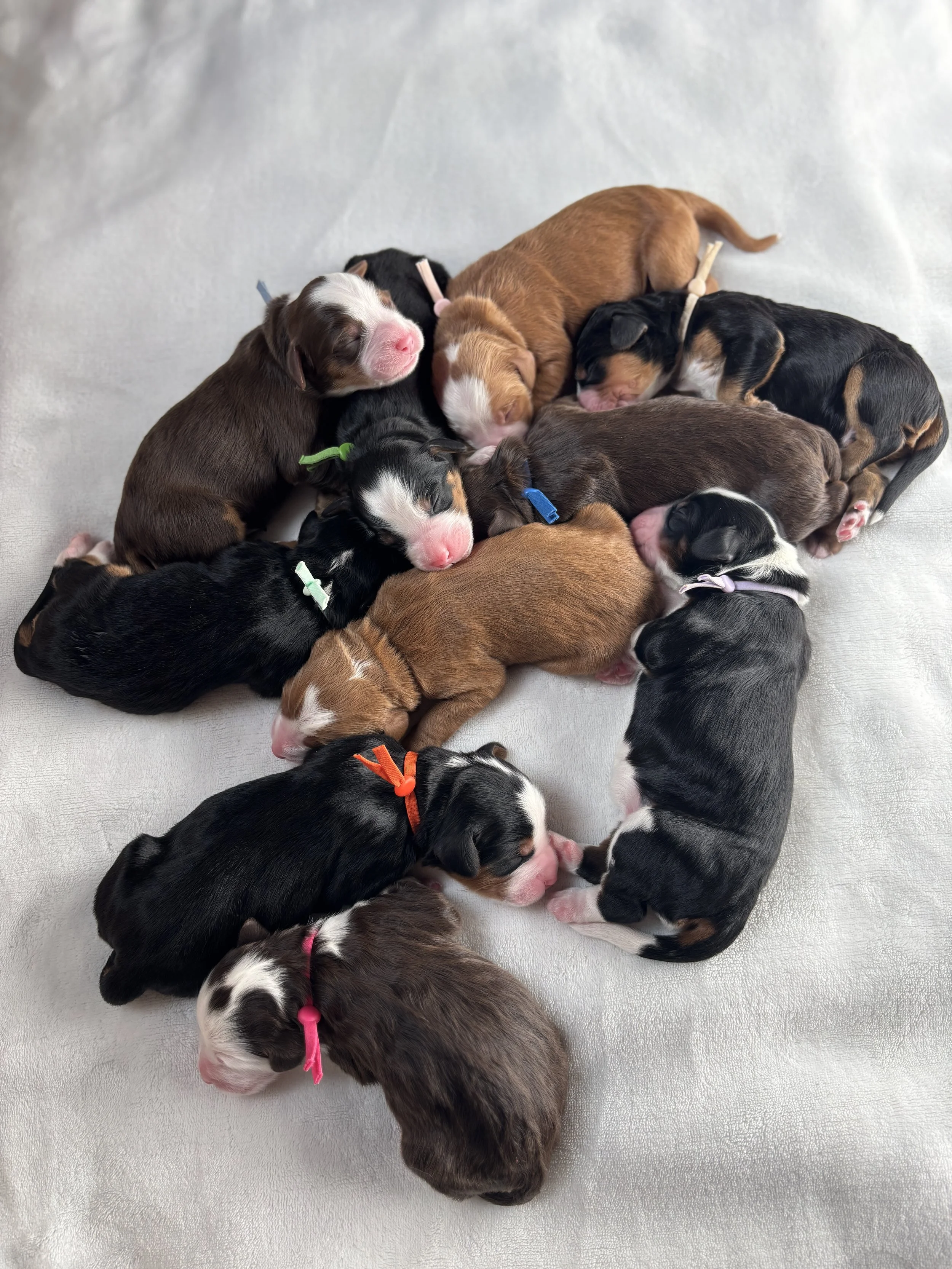 We are so excited for this new litter of medium bernedoodles from Roo and Rooster. These puppies are expected to weigh between 35-55 pounds. They’ll have silky soft, wavy, non shedding coats. Roo had 10 absolutely gorgeous puppies. 5-females and 5-males.